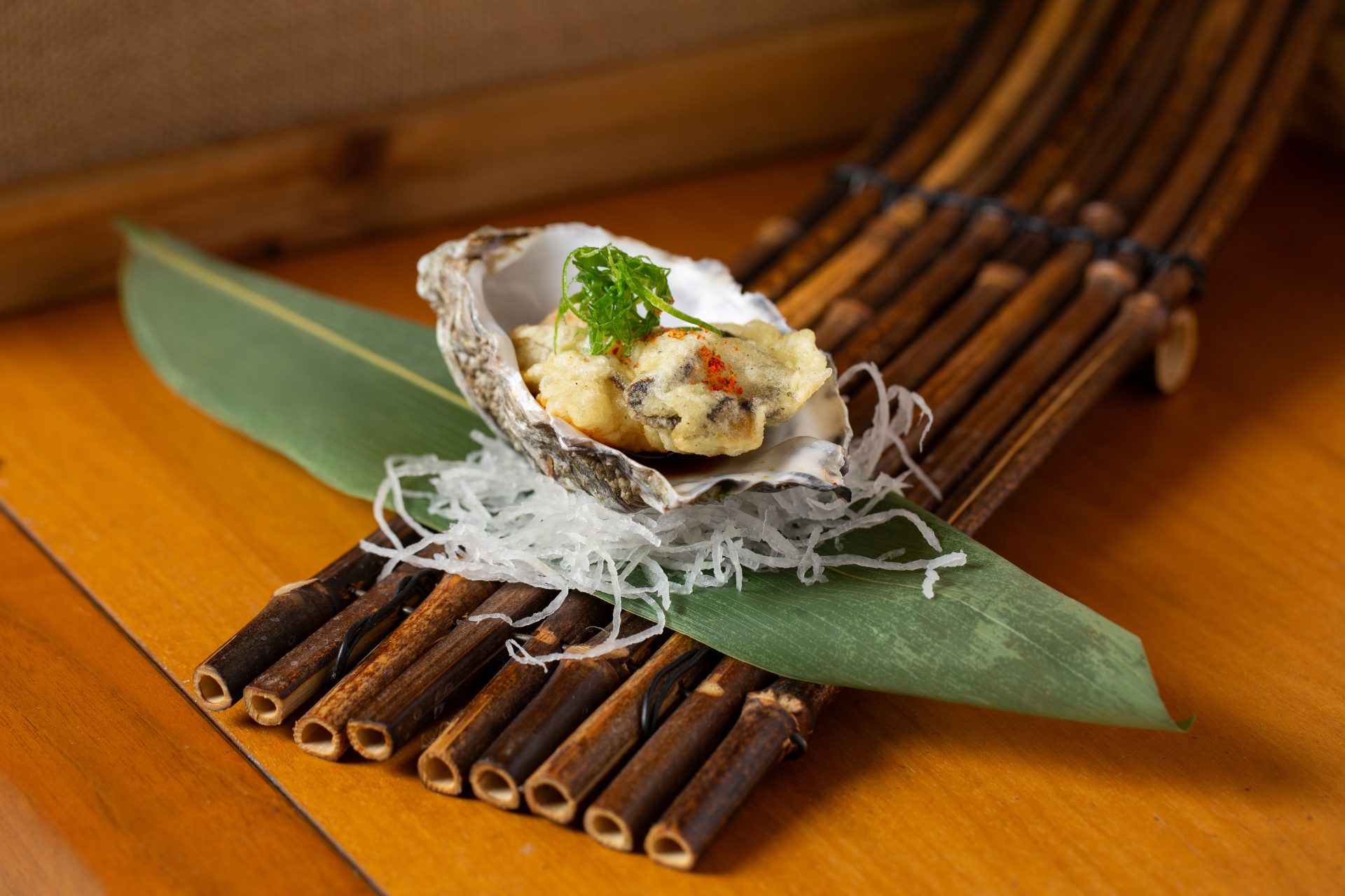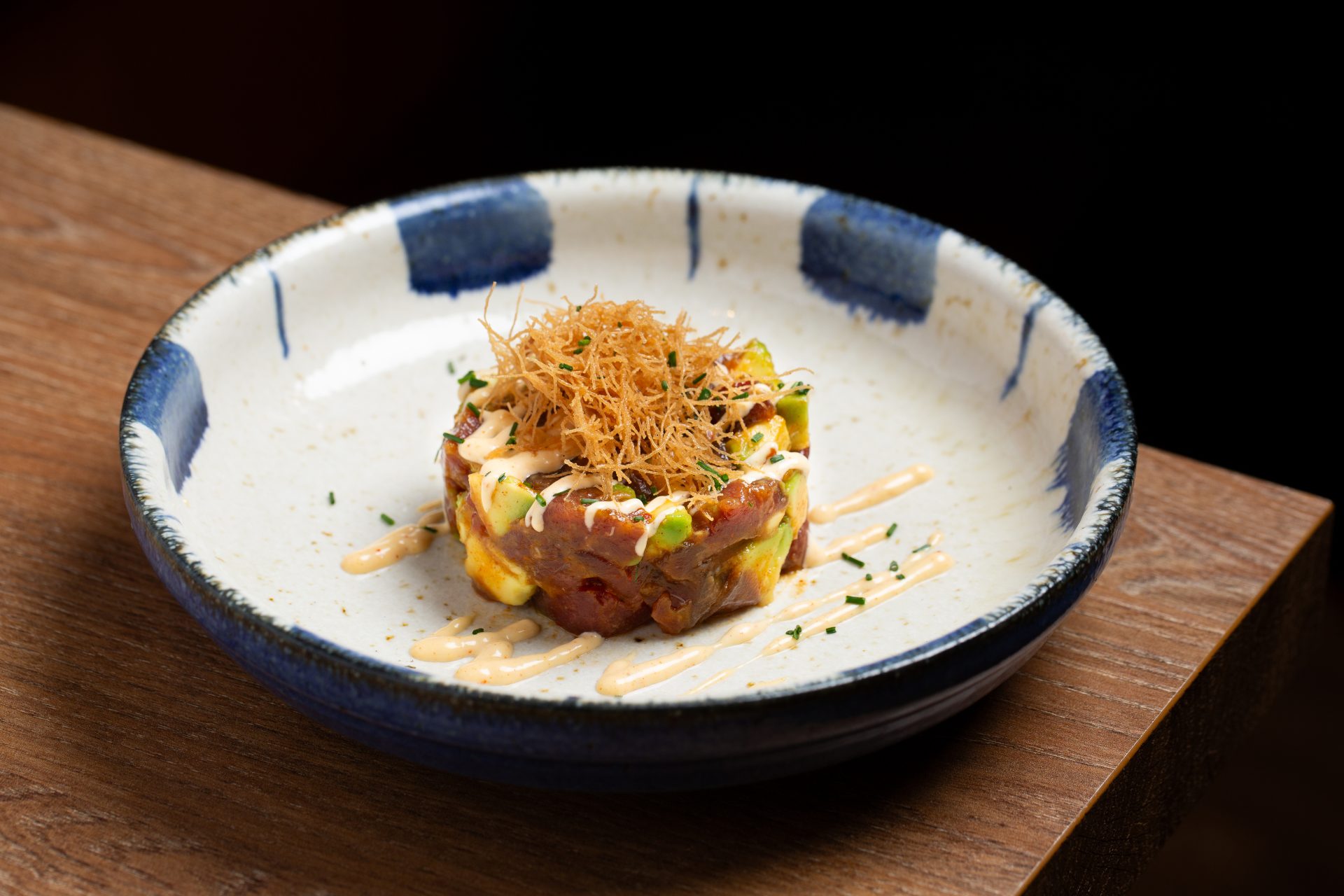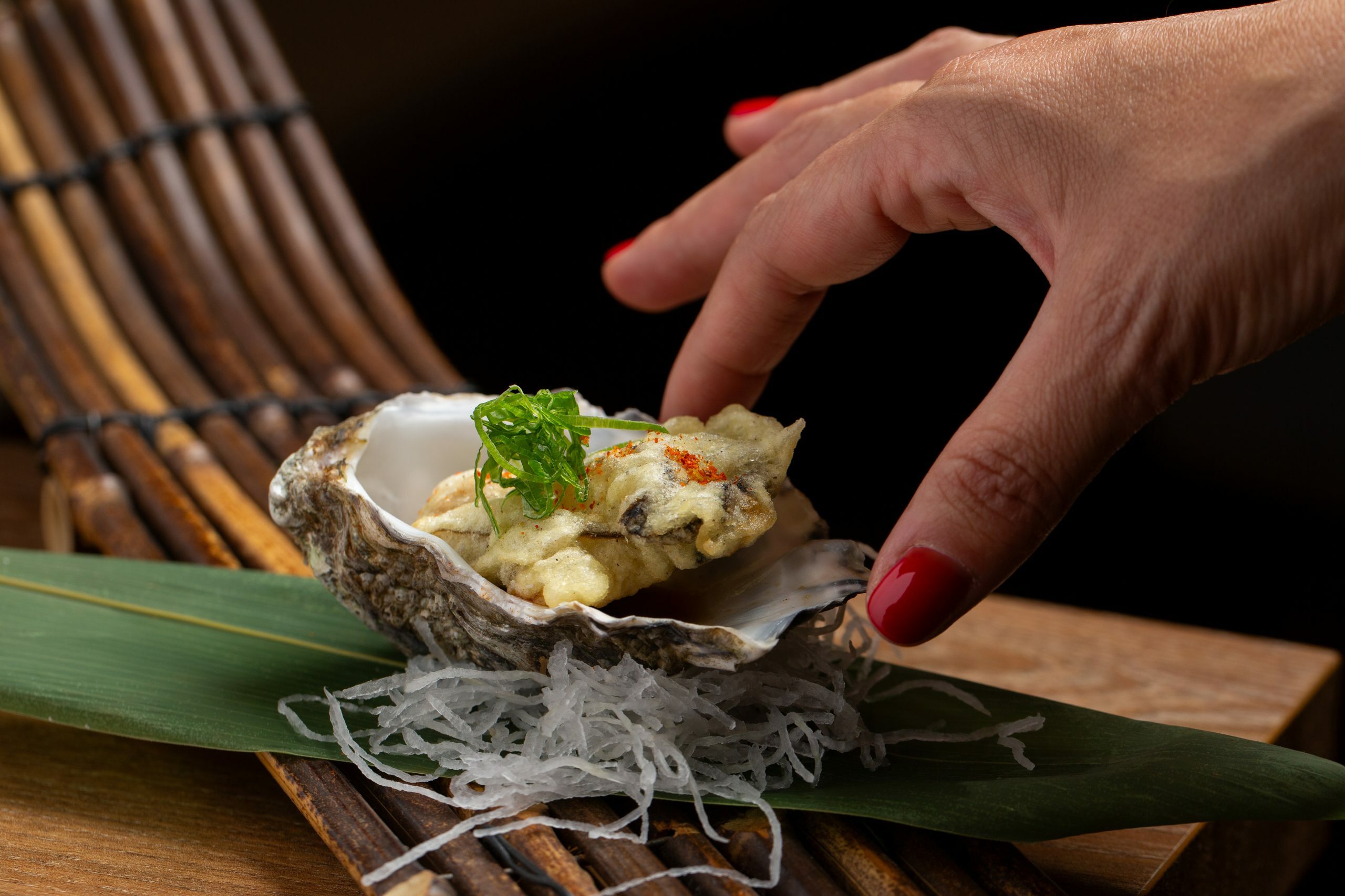 Ramen (frío) de aguachile de yuzu y jalapeños, langostinos al wok y mejillones en americana