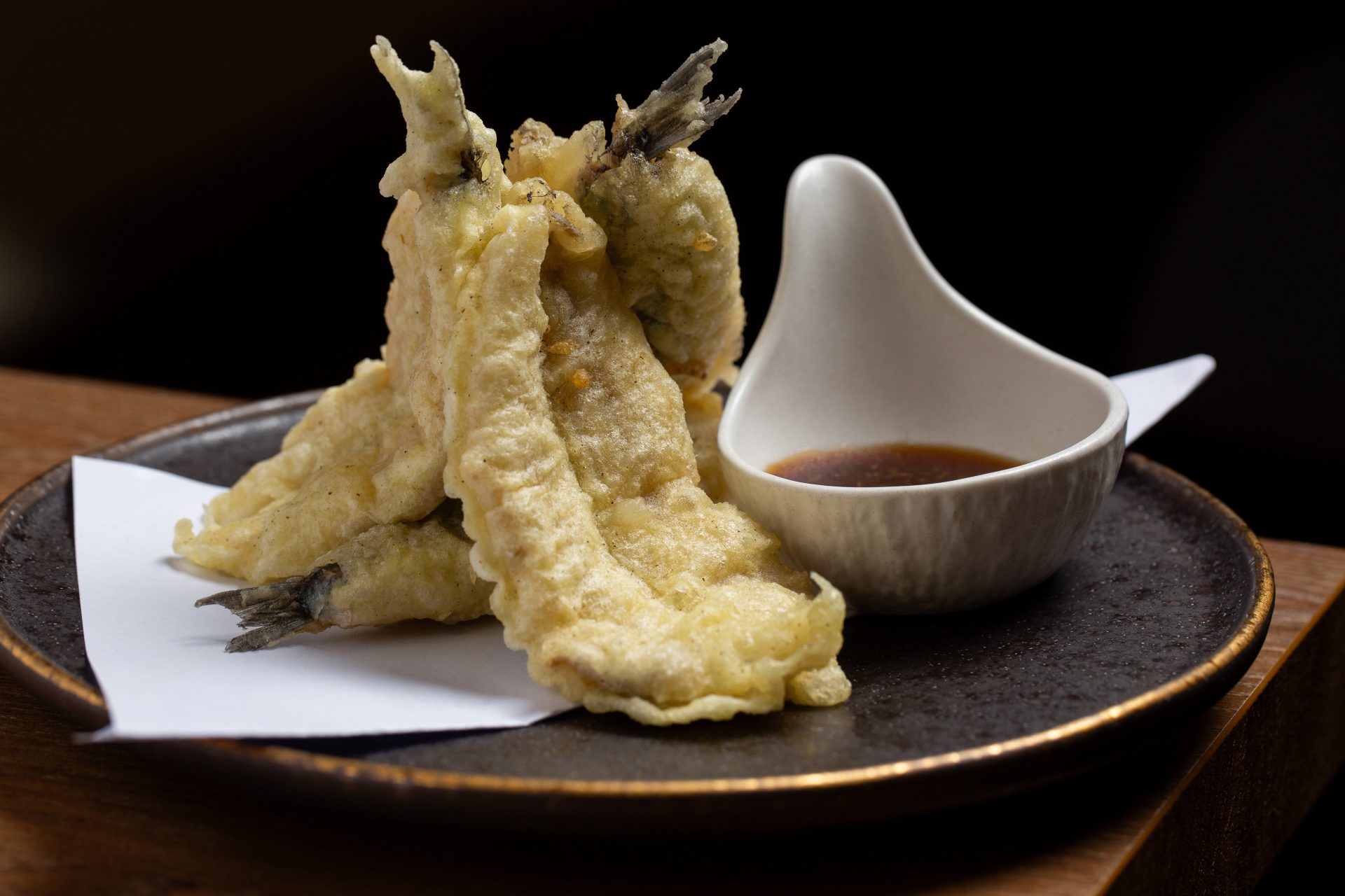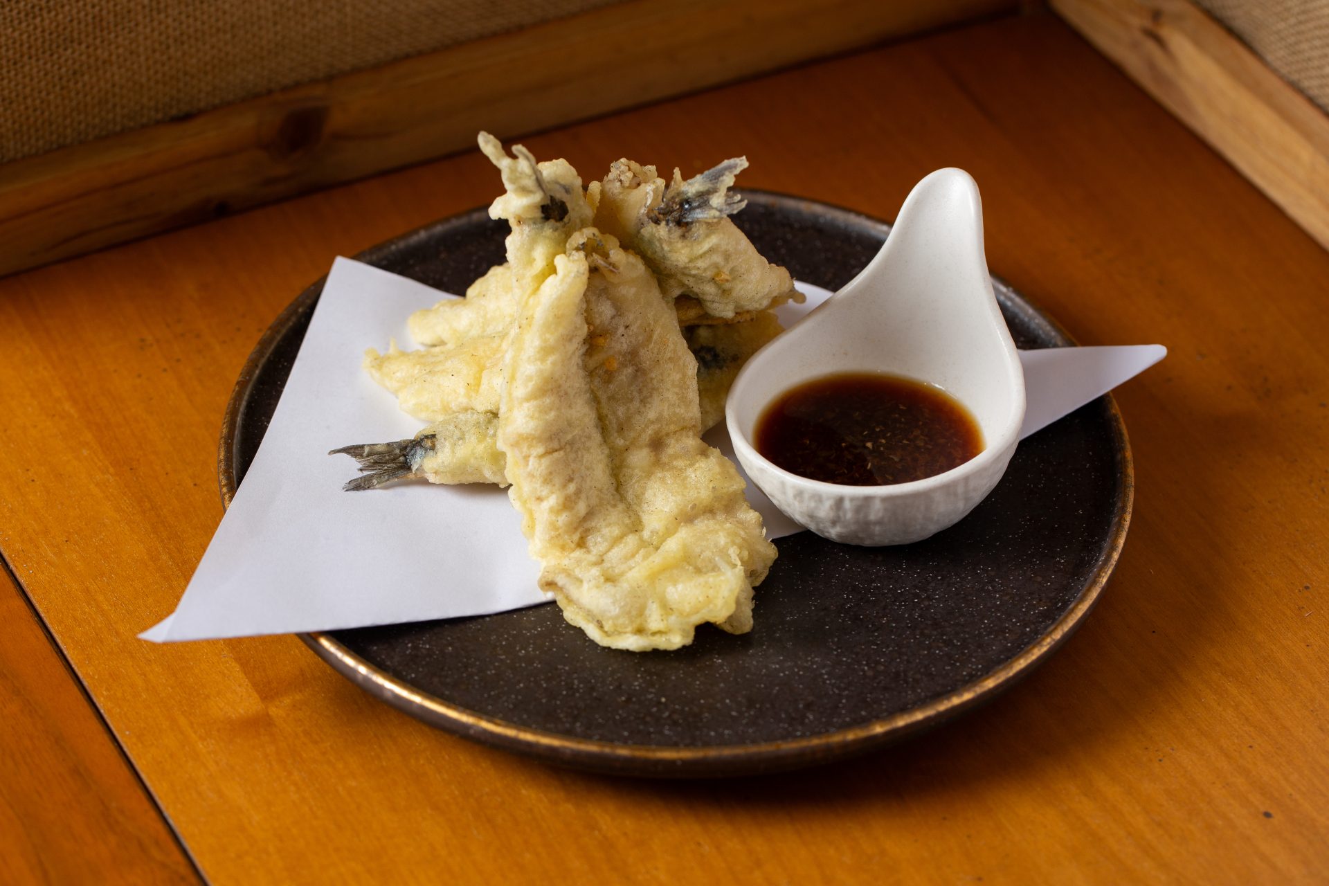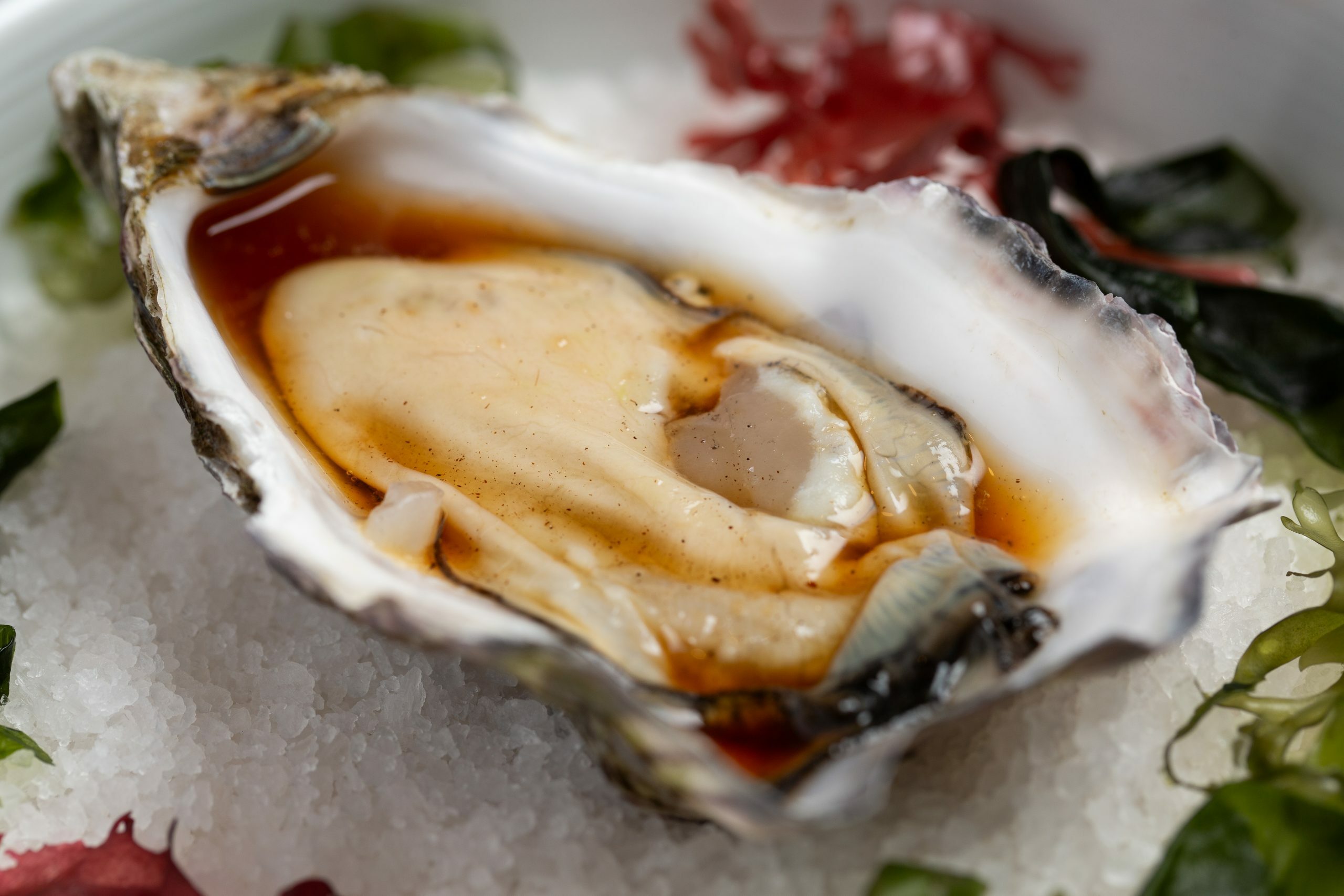 Ramen (frío) de aguachile de yuzu y jalapeños, langostinos al wok y mejillones en americana