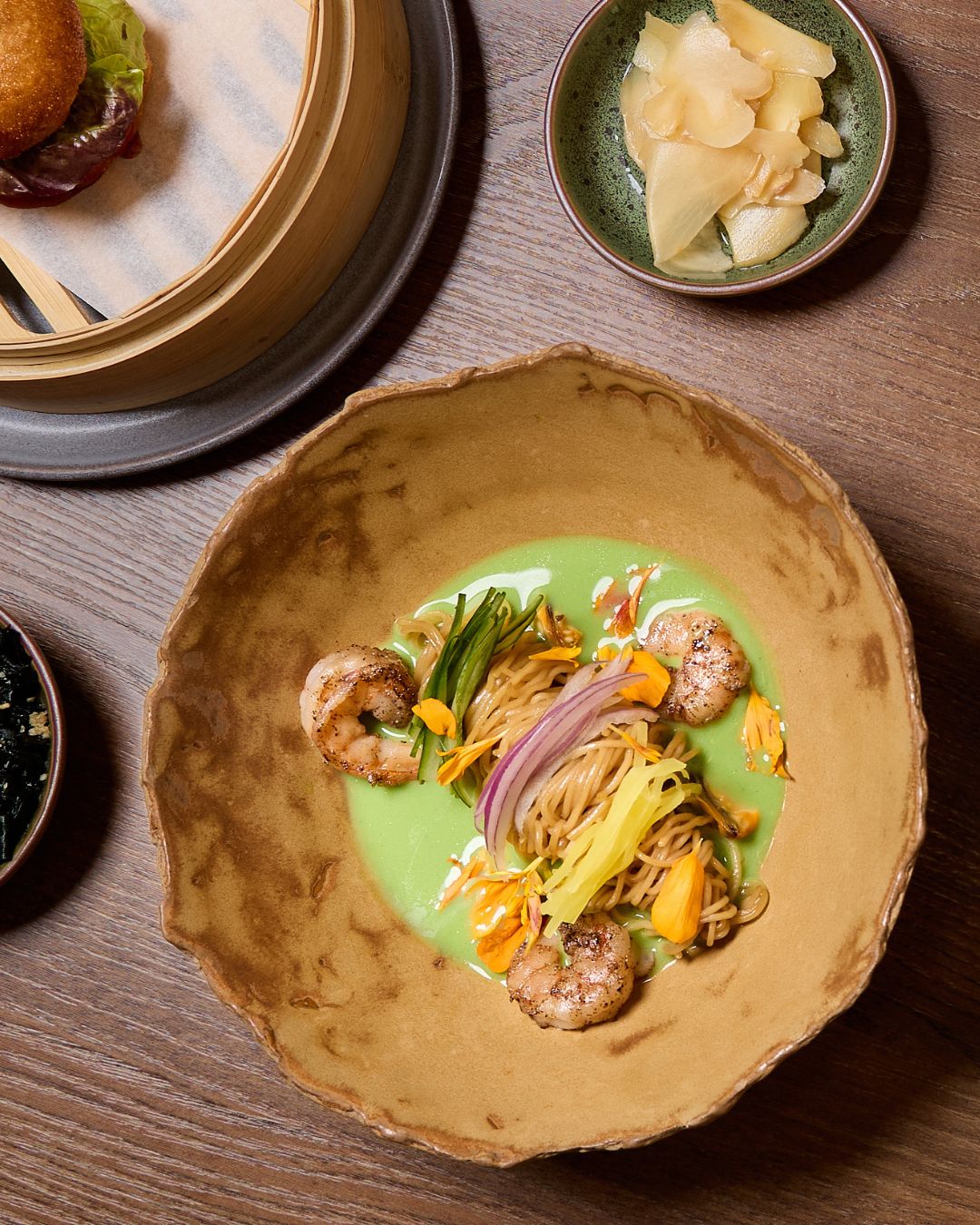 Hiyashi ramen de aguachile de jalapeño y yuzu, langostinos al wok y mejillones