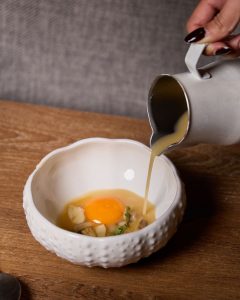 (Setas, yema de huevo de pollita, caldo de pollo asado agripicante)