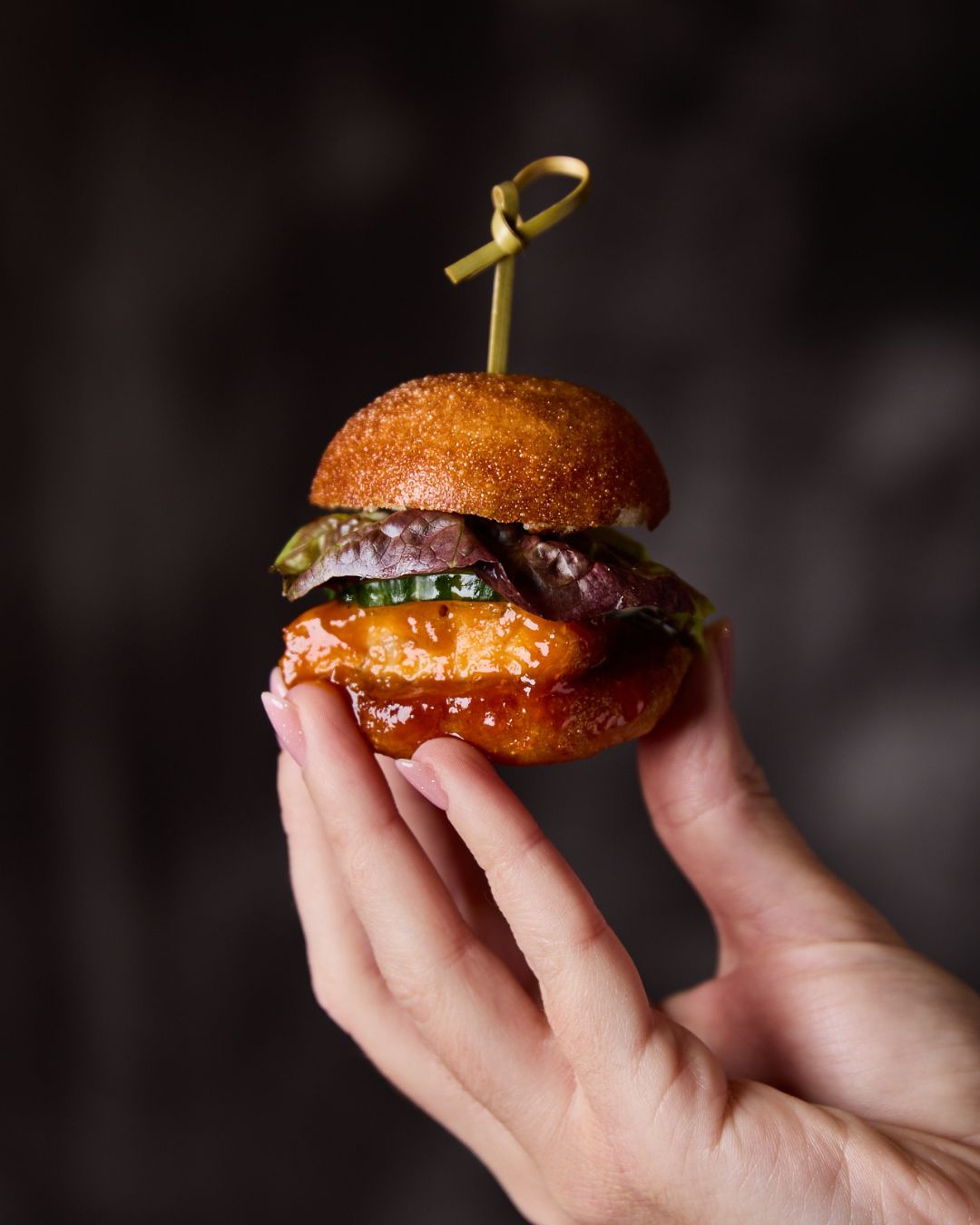 «Baocata» de pollo karaage mojado en dakgangjeong, tzalsiki, pepino y cogollo